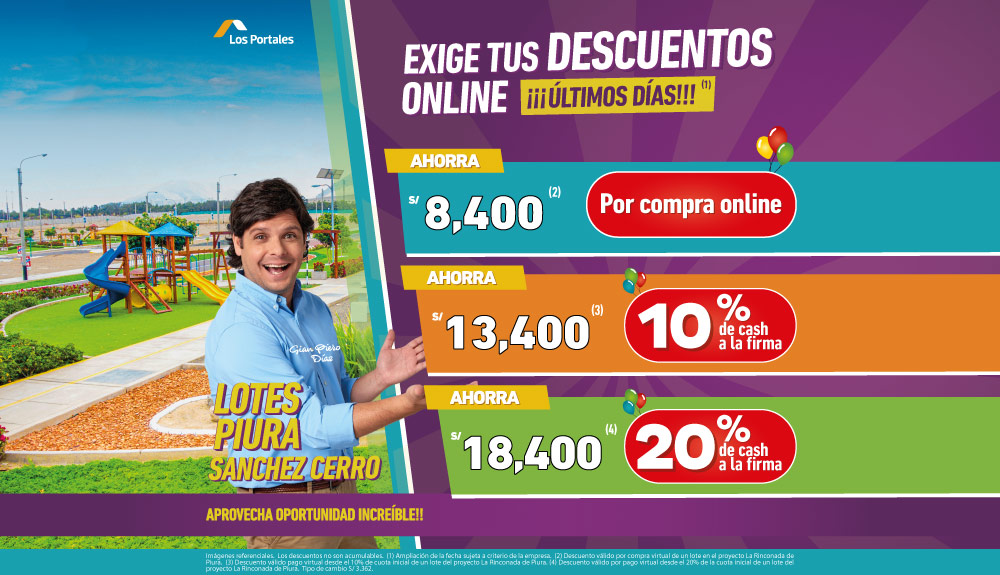 Imágenes referenciales sujetas a variación. (1) Precio por pago al contado para lotes de 90 m2 cuyo precio ascienda a US$17,100 ó S/61,560 pertenecientes al proyecto "La Planicie de Piura-V Etapa". (2) Cuota mensual estimada para crédito directo abonando el 4% del precio del inmueble como cuota inicial y el saldo hasta en 96 meses para pagar. Válida para lotes de 90 m2 cuyo precio contado ascienda a US$17,100 ó S/61,560 pertenecientes al proyecto "La Planicie de Piura-V Etapa". TCEA 23%. Stock disponible 03 unidades. Tipo de cambio aplicable S/ 3.60