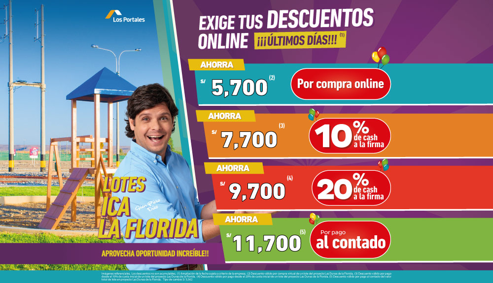 Imágenes referenciales sujetas a variación. (1) Precio aplicando bono de descuento de US$3,500 por pago al contado para lotes de 90 m2 cuyo precio ascienda a US$15,990 ó S/57,564 pertenecientes al proyecto "Dunas de La Florida-I Etapa". (2) Cuota mensual estimada para crédito directo abonando el 50% del precio del inmueble como cuota inicial y el saldo hasta en 72 meses para pagar. Válida para lotes de 90 m2 cuyo precio contado ascienda a US$15,990 ó S/57,564 pertenecientes al proyecto "Dunas de La Florida- I Etapa". TCEA 23%. Stock disponible 03 unidades. Tipo de cambio aplicable S/ 3.60