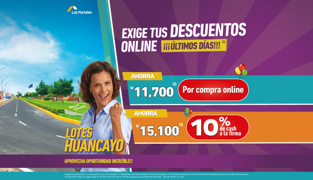 Imágenes referenciales sujetas a variación. (1) Precio aplicando bono de descuento de US$2,000 por pago al contado para lotes de 90 m2 cuyo precio ascienda a US$18,990 ó S/63,364 pertenecientes al proyecto "Los Eucaliptos de Huancayo-II Etapa". (2) Cuota mensual estimada para crédito directo abonando el 50% del precio del inmueble como cuota inicial y el saldo hasta en 72 meses para pagar. Válida para lotes de 90 m2 cuyo precio contado ascienda a US$18,990 ó S/63,364 pertenecientes al proyecto "Los Eucaliptos de Huancayo-II Etapa". TCEA 23%. Stock disponible 02 unidades. Tipo de cambio aplicable S/ 3.60