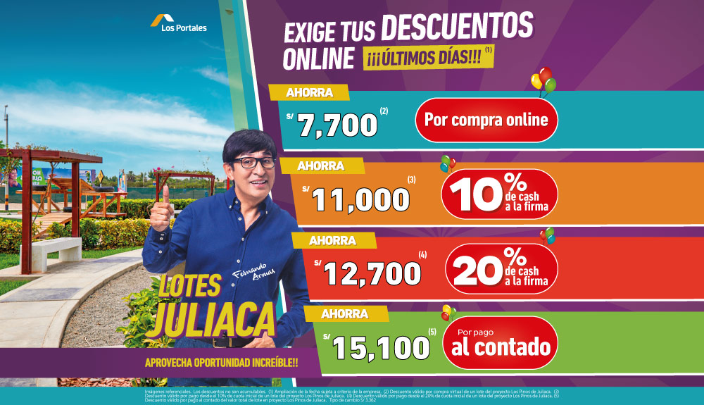 Imágenes referenciales sujetas a variación. (1)Precio aplicando bono de descuento de US$500 por pago al contado para lotes de 90 m2 cuyo precio ascienda a US$13,900 ó S/50,040 pertenecientes al proyecto "Los Pinos-I Etapa". (2) Cuota mensual estimada para crédito directo abonando el 50% del precio del inmueble como cuota inicial y el saldo hasta en 84 meses para pagar. Válida para lotes de 90 m2 cuyo precio contado ascienda a US$13,900 ó S/50,040 pertenecientes al proyecto "Los Pinos-I Etapa". TCEA 23%. "a. Partida registral del inmueble matriz: Partida matriz N° 11190838. del Registro de Predios de Juliaca. b. Situación del proceso de habilitación urbana o de licencias de edificación, según corresponda: El proyecto cuenta con LHU N° 287-2016-MPSRJ/GEDU otorgada por la Municipalidad de San Román. c. Plano del proyecto ofertado: el plano proyectado es el que consta en visor de planos, siendo aspectos referenciales los siguientes: distribución de las áreas comunes, cantidad de lotes. d. Cantidad de unidades inmobiliarias proyectadas inicialmente: 267 lotes e. Características principales del proyecto: Consiste en un proyecto de Habilitación Urbana de Vivienda Primaria que consta de 267 lotes desde 90 m2, con conexiones domiciliarias completas, redes sanitarias de alcantarillado y buzones, entrega de obras eléctricas aéreas (redes eléctricas en media tensión y baja tensión), entrega de parques, vías (vías asfaltadas y veredas de concreto, bermas laterales, sardineles, señalización horizontal y vertical). f. Áreas, bienes y servicios comunes de ser el caso: No es condominio no cuenta con áreas comunes, la HU cuenta con áreas públicas parques, alumbrado público, vías asfaltadas, veredas de concreto, pórtico de ingreso. g. Servicios públicos: Conexiones domiciliarias completas, redes sanitarias de alcantarillado y buzones, entrega de obras eléctricas aéreas (redes eléctricas en media tensión y baja tensión). h. Precios de venta del proyecto: Desde $15,900 hasta $24,990 dependiendo de la ubicación concreta de la unidad inmobiliaria elegida por el cliente. i. Formas de pago y plazos: dependiendo del producto elegido por el cliente las formas de pago pueden ser al contado, mediante crédito directo (verificar la pestaña Información de la Empresa) y/o mediante crédito hipotecario. j. Moneda en la que se realiza el pago: El proyecto se comercializa en dólares k. Gastos notariales: la formalización de la transferencia de propiedad del inmueble a favor del cliente, luego de la cancelación del mismo y de la inscripción registral de la titulación del proyecto, se realiza a través de la firma de una escritura pública de compraventa. Los honorarios notariales y gastos registrales correspondientes a la inscripción de la compraventa en el Registro de Predios correspondiente corren por cuenta del cliente. l. Tributos: la compraventa de inmuebles está afecta al pago del Impuesto de Alcabala, de acuerdo a las disposiciones contenidas en el D. Legislativo N° 776, Ley de Tributación Municipal. Asimismo, la condición de titularidad de un inmueble determina el pago del Impuesto Predial del mismo, de acuerdo a las disposiciones contenidas en el D. Legislativo N° 776, Ley de Tributación Municipal. m. Condiciones de la separación: la separación de unidades inmobiliarias se realiza mediante recibos de separación, que detallan las condiciones generales aplicables a la separación para cada tipo de producto.