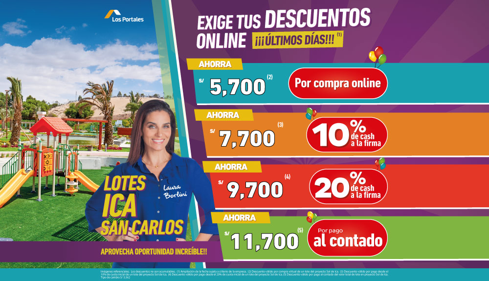 Imágenes referenciales sujetas a variación. (1) Precio aplicando bono de descuento de US$2,000 por pago al contado para lotes de 72 m2 cuyo precio ascienda a US$13,990 ó S/50,364 pertenecientes al proyecto "Sol de Ica-XVI Etapa". (2) Cuota mensual estimada para crédito directo abonando el 50% del precio del inmueble como cuota inicial y el saldo hasta en 72 meses para pagar. Válida para lotes de 72 m2 cuyo precio contado ascienda a US$13,990 ó S/50,364 pertenecientes al proyecto "Sol de Ica-XVI Etapa". TCEA 23%. Tipo de cambio aplicable S/ 3.60 El Proyecto y unidades inmobiliarias que lo conforman cuya información se detalla a continuación tiene la condición de bien futuro, es decir, se encuentra en proceso de ejecución y como tal puede ser objeto de modificaciones hasta la oportunidad de recepción de obras del mismo. Durante la etapa de ejecución de las obras del proyecto y posterior recepción de obras por parte de la Municipalidad correspondiente, se producirá el replanteo final del Proyecto, el cual podrá generar variaciones en la cantidad de unidades inmobiliarias, el área, numeración y/o ubicación final y definitiva de las mismas, áreas y vías públicas, o áreas y servicios comunes si los hubiera. a. Partida registral del inmueble matriz: Partida matriz N° 11007107 del Registro de Predios de Ica. b. Situación del proceso de habilitación urbana o de licencias de edificación, según corresponda: LHU en trámite c. Plano del proyecto ofertado: el plano proyectado es el que consta en imagen, siendo aspectos referenciales los siguientes: distribución de áreas comunes y cantidad de lotes. d. Cantidad de unidades inmobiliarias proyectadas inicialmente: 162 e. Características principales del proyecto: Consiste en la habilitación urbana convencional de 162 lotes Además de la entrega de las obras de agua y desagüe a EPS (conexiones domiciliarias completas, redes sanitarias de alcantarillado, buzones), entrega de obras eléctricas a Electro dunas S.A. (Redes eléctricas en media tensión y baja tensión), entrega de parques, vías (vías de veredas de concreto, bermas laterales, sardineles, señalización horizontal y vertical) y áreas educativas (Ministerio de Educación), y otros fines. f. Áreas, bienes y servicios comunes de ser el caso: este proyecto contempla áreas verdes (02 parques). g. Servicios públicos: - Obras de agua y desagüe a EPS (conexiones domiciliarias completas, redes Sanitarias de alcantarillado, buzones) - Entrega de obras eléctricas a Electro dunas S.A. (Redes eléctricas en media tensión y baja tensión) h. Precios de venta del proyecto: Desde $11,990 hasta $16,990, dependiendo de la ubicación concreta de la unidad inmobiliaria elegida por el cliente. i. Formas de pago y plazos: dependiendo del producto elegido por el cliente las formas de pago pueden ser al contado, mediante crédito directo. j. Moneda en la que se realiza el pago: Dólares k. Gastos notariales: la formalización de la transferencia de propiedad del inmueble a favor del cliente, luego de la cancelación del mismo y de la inscripción registral de la titulación del proyecto, se realiza a través de la firma de una escritura pública de compraventa. Los honorarios notariales y gastos registrales correspondientes a la inscripción de la compraventa en el Registro de Predios correspondiente corren por cuenta del cliente. l. Tributos: la compraventa de inmuebles está afecta al pago del Impuesto de Alcabala, de acuerdo a las disposiciones contenidas en el D. Legislativo N° 776, Ley de Tributación Municipal. Asimismo, la condición de titularidad de un inmueble determina el pago del Impuesto Predial del mismo, de acuerdo a las disposiciones contenidas en el D. Legislativo N° 776, Ley de Tributación Municipal. m. Condiciones de la separación: la separación de unidades inmobiliarias se realiza mediante recibos de separación, que detallan las condiciones generales aplicables a la separación para cada tipo de producto.
