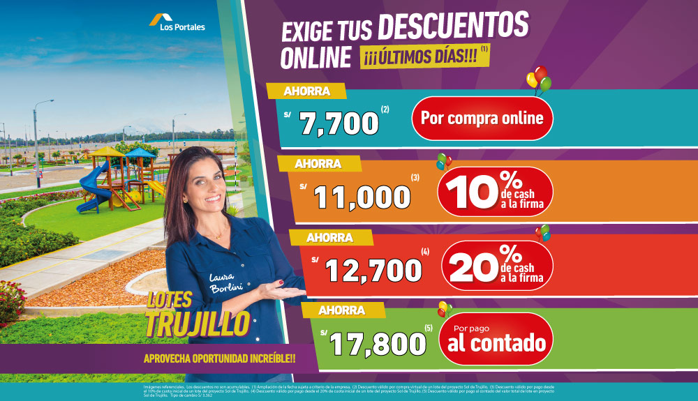 (1) Precio por pago al contado para lotes de 90 m2 cuyo precio ascienda a US$17,842 ó S/64,231 pertenecientes al proyecto "Sol de Trujillo-III Etapa". (2) Cuota mensual estimada para crédito directo abonando el 4% del precio del inmueble como cuota inicial y el saldo hasta en 84 meses para pagar. Válida para lotes de 90 m2 cuyo precio contado ascienda aUS$17,842 ó S/64,231 pertenecientes al proyecto "Sol de Trujillo-III Etapa". TCEA 23%. Stock disponible 03 unidades. Tipo de cambio aplicable S/ 3.60